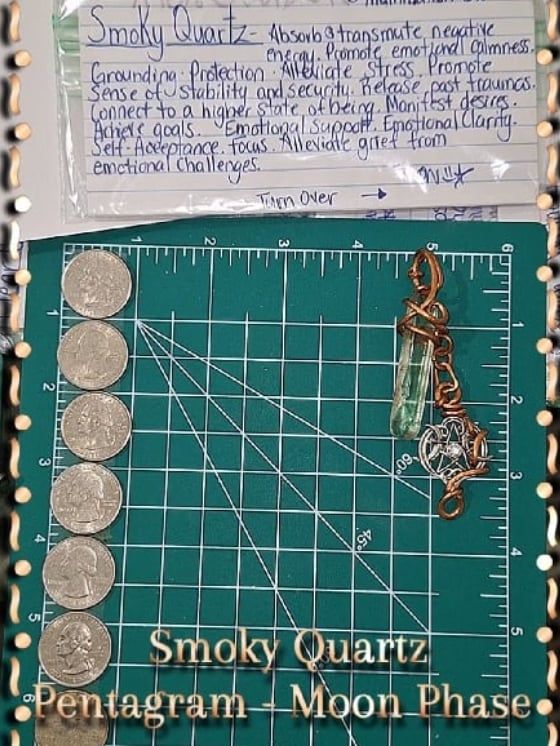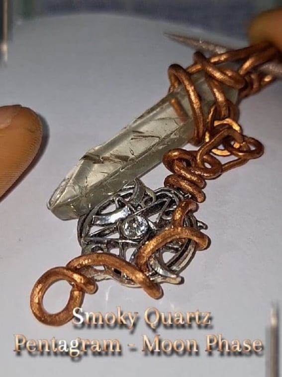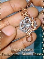 Smoky Quartz. Such a fragile yet powerful crystal. The Pentacle and Moon Phase charm is a fave that I like to work with. The inclusions in this stone look like five bats floating, I enjoy the length on this pendant. It has dangle movement and was so fun to wrap with the minimal style.