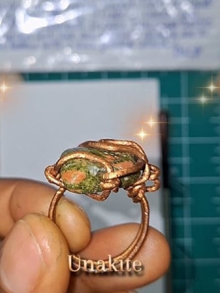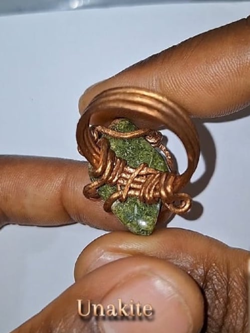 I really try to make all the rings adjustable. There are times where I just get to wrapping and I have a size set in my head. This was one of those times and here we have a size 12 ring. The shape and flatness of this stone made it perfect for a ring. I love the waves and spirals that hold this stone in place. A triple band give for a more full look and security due to the stone size.